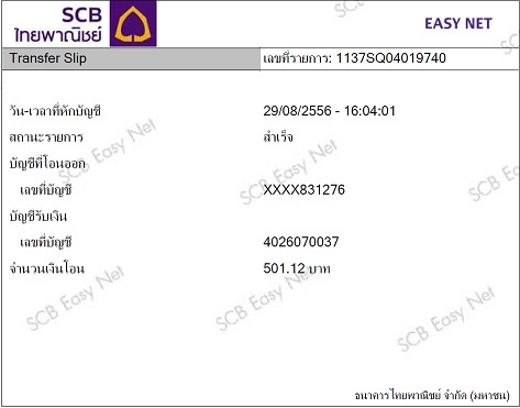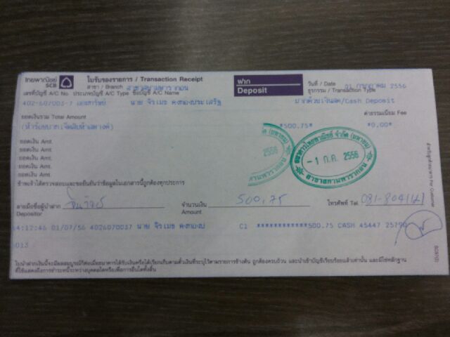 โอนเงิน scb สาขา สยามพารากอน จำนวนเงิน 500.75 บาท วันที่ 01/07/56 เวลา 14:12:46 น.