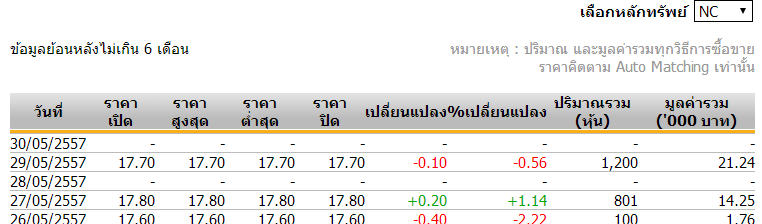 เช่น หุ้น NC ไม่มีการซื้อขายในวันที่ 30 พฤษภาคม 2557 (มีการซื้อขายล่าสุด 29 พฤษภาคม 2557 ราคาปิดคือ 17.70)